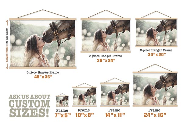 Hanging Frame Style: for a modern, minimalist vibe, the Hanging Frame uses two sets of wood slats (one at the top, one at the bottom) with embedded magnets to securely hold your canvas or premium art paper portrait. Hanging Frames come with everything you need to hang them with ease.