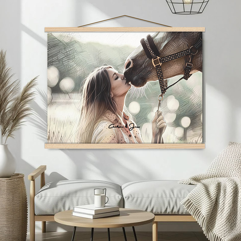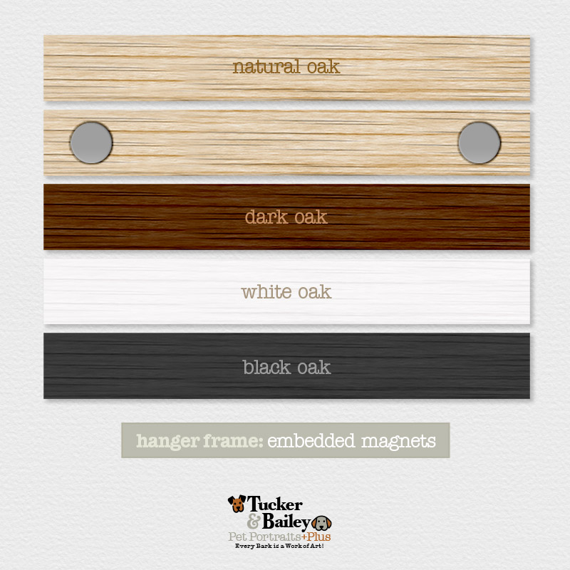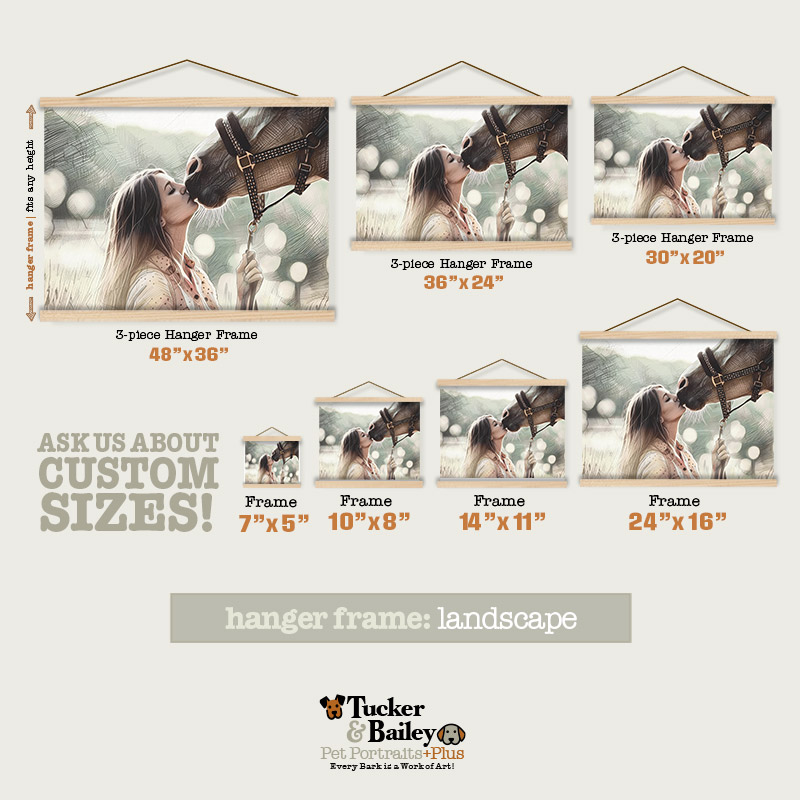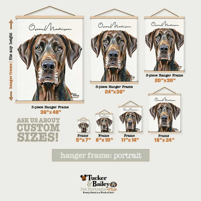 At Tucker & Bailey Pet Portraits+Plus, we offer framing options that make your artwork POP! Whether you prefer a classic vibe or something a little more artsy, our frames match your portrait style and make your artwork shine. Want a cool, modern way to display your portrait? Your Hanging Frame uses two sets of magnetic wood slats to hold your canvas or art paper securely—one at the top, one at the bottom. Pick your favorite cord, thread it through the top slat, knot it to your preferred length, and let the magnets grip your print’s edges. For the best fit, go for a hanging frame 1 or 2 inches longer than your portrait’s width.